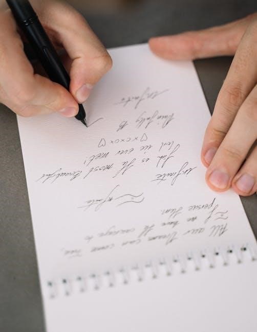 Simple words and short phrases are introduced gradually. The emphasis is on proper grip, posture, and consistent letter size. These PDFs build confidence and establish a solid base for further practice, ensuring legibility.